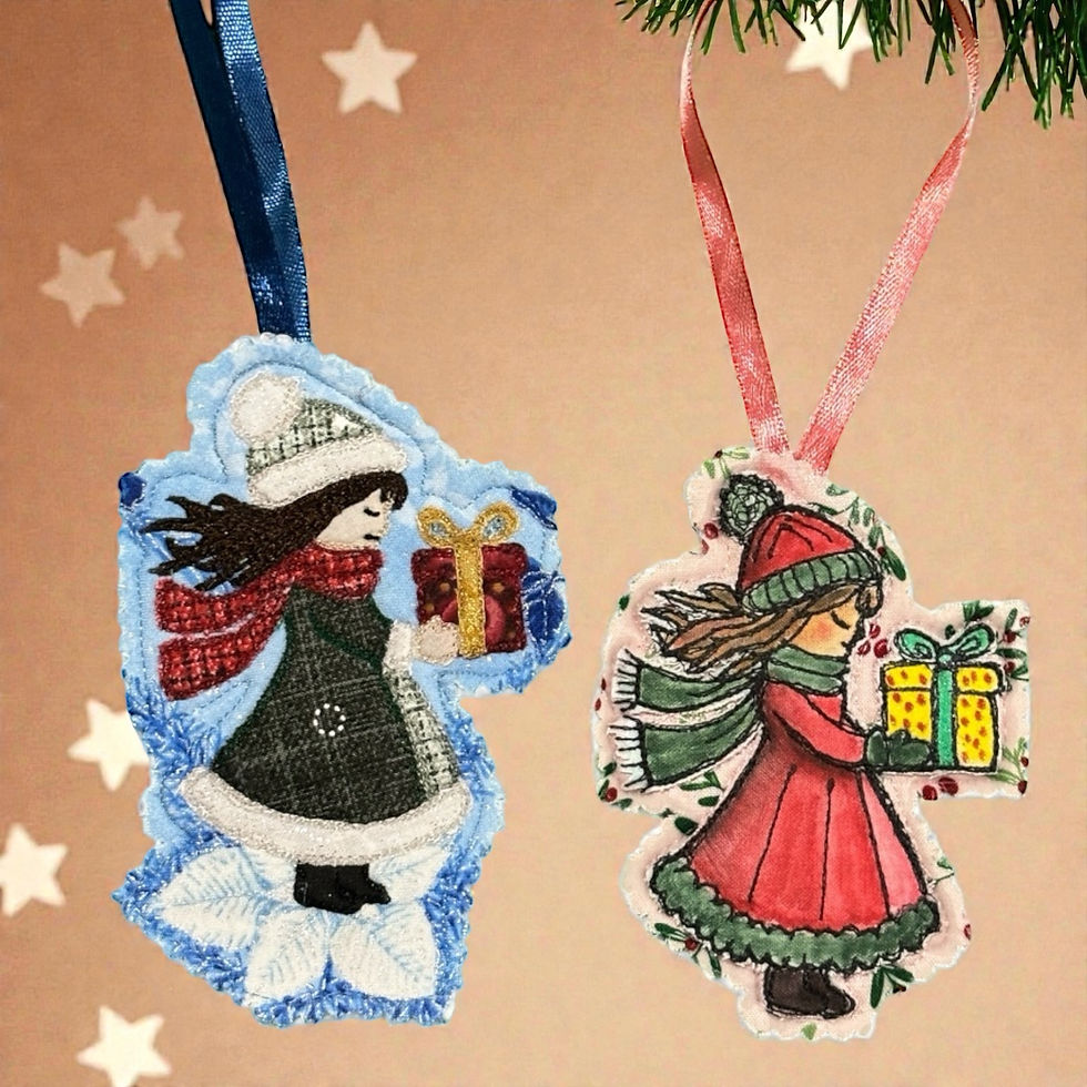 There’s something undeniably magical about turning a simple line drawing into a keepsake you can hang on your tree. These last few months while in the studio, I had the joy of creating two versions of the same sweet winter girl, each made with a completely different method. And friends… I loved both for totally different reasons.